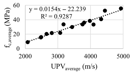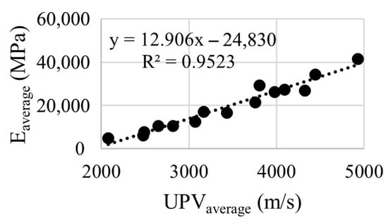 The relationships between the average values of UPV and mechanical properties at different exposure temperatures are shown in Figure 16 and Figure 17, and they clearly show that there is good agreement between the linear regression analysis equation and the experimental results. This leads to the possibility of estimating the compressive strength and modulus of elasticity based on the UPV values.