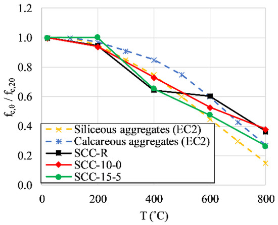 A decrease in the UPV value with an increase in rubber content (and consequently a decrease in natural aggregate) can be explained by the lower specific gravity of recycled rubber compared to natural aggregate [76], which increases the time required for the ultrasonic pulse to pass through the concrete specimen. If the specimens are exposed to temperatures higher than 200 °C, the reduction in the UPV value can be explained by the increased number of discontinuities and air cavities caused by high temperatures and combustion of recycled rubber [30,33]. Additionally, the decrease in the UPV values with the increase in temperature is directly related to the decrease in the mechanical properties of the concrete. Therefore, an estimation of the high-temperature effect on the mechanical properties can be performed using the UPV values, providing insight into the structural capacity of a reinforced concrete member. To evaluate the quality of SCC after exposure to high temperatures, the obtained average UPV values were compared with the limit values given in ASTM C597 [77] (Table 6). It can be concluded that the specimens can be classified as good-quality concrete up to an exposure temperature of 400 °C, after which the concrete quality for the SCC-10-0 and SCC-15-5 mixtures becomes generally or extremely poor, while the SCC-R mixture after exposure to a temperature of 600 °C still shows good quality.
