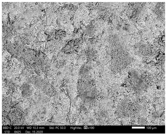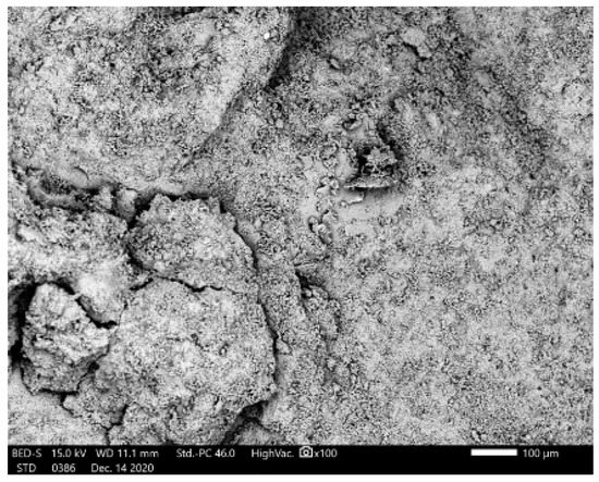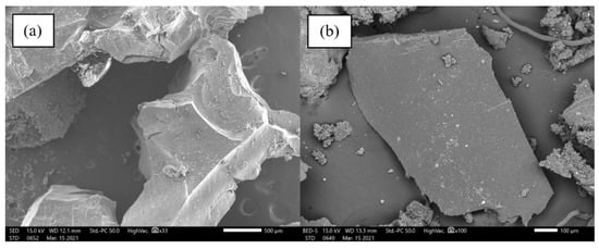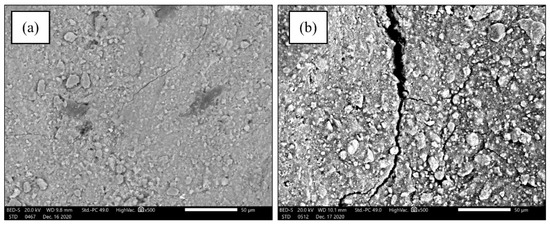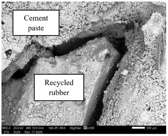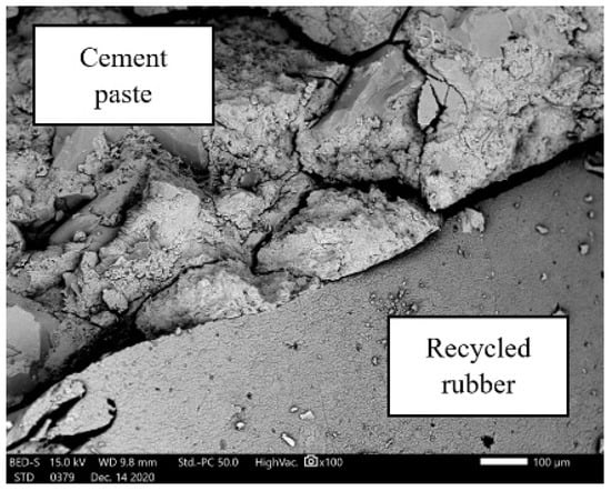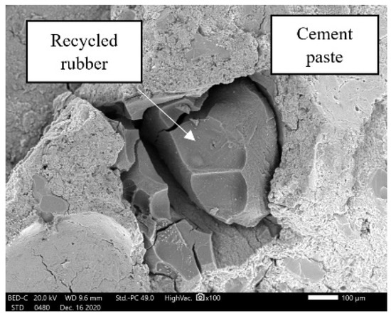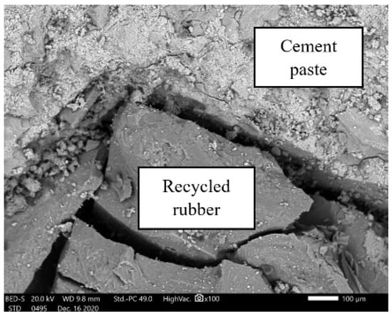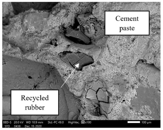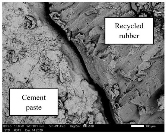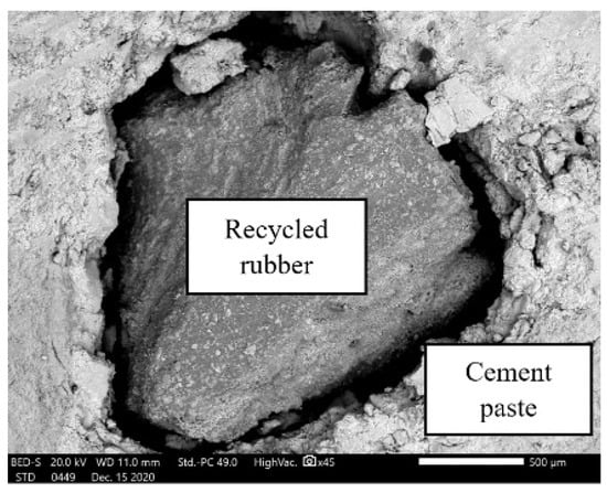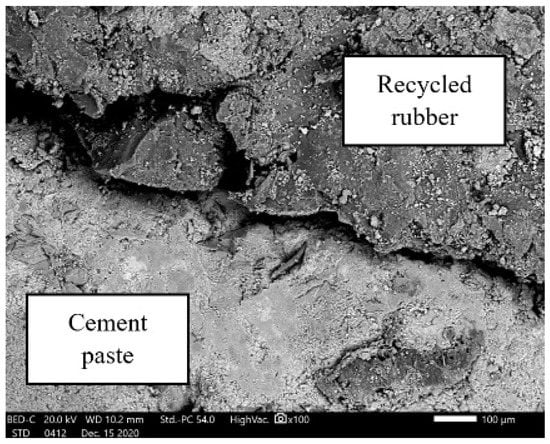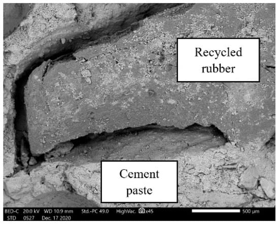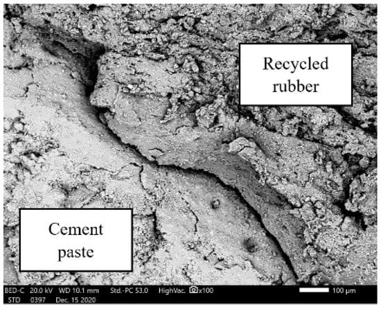 In previous research [25,28], it was concluded that the grain size of the rubber plays an important role in the scaling of concrete after freeze–thaw cycles. The best results were obtained when the fine rubber aggregate was used, as it has a larger specific surface area compared to coarse recycled rubber, causing an increased number of micropores that entrap air in cement paste. The air increases the porosity of the concrete mixture and provides a higher resistance to freeze–thaw cycles, similar to the effects provided by the use of aerants [70]. Furthermore, the rough edges of rubber entrap air bubbles, which provides better transmission of the internal stresses caused by an increase in volume due to the transition of water from liquid to solid state. Internal forces which occur during expansion in concrete with recycled rubber have less destructive consequences as the higher amount of micropores provides additional space for ice and salt crystals [24] to spread at temperatures below 0 °C. The rubber itself is more resistant to freezing than natural aggregate and can provide a mechanism in which through greater deformability it absorbs internal stresses caused by an increase in volume, thus relieving stress from the surrounding cement paste. The described mechanism also prevents the premature occurrence of cracks in concrete, which is associated with an improvement in the serviceability of the concrete. It is important to point out that recycled rubber can not only be used as a substitute for natural aggregate but also as an aerant, providing savings for concrete intended for use in an environment where there is a risk of corrosion caused by freeze–thaw cycles.