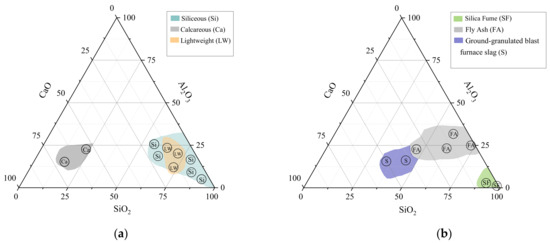 A fire can occur during concrete service life, causing severe casualties and property damage [1]. Several mechanical and environmental factors can influence the deterioration of concrete when exposed to high temperatures, such as the level of high temperatures, humidity, the applied load, the heating time, the cooling method after heating, the aggregate type, the mineral admixtures, and the inclusion ratios [2]. Since the aggregates make up 60–75% of the volume of concrete, they significantly affect the behaviour of concrete at room and high temperatures [3]. Coarse aggregates are classified into three groups according to their chemical composition and mineralogical nature: siliceous (Si) aggregate, calcareous (Ca) aggregate, and lightweight aggregate (LWA). Figure 1a shows the chemical compositions (e.g., SiO2, Al2O3, and CaO) of siliceous and calcareous aggregates.