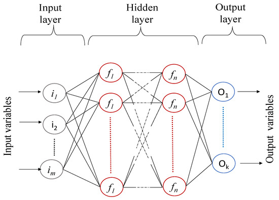 The artificial neural network predicts the behaviour of the study subject by learning through past experiments and identifying the pattern of the collected data [28]. Generally, a neural network is developed by acquiring and analyzing data and creating a database, determining the architecture, training the network, determining the learning process, and evaluating the generalization of the network after training [29]. The topology of artificial neural networks is similar to the human brain in two aspects: (1) the neural network acquires knowledge from its environment using a learning process and (2) the acquired knowledge is stored in interneuron connections strengths or (synaptic) weights [30]. ANN models are comprised of a large number of neurons, which serve as data processing units. As seen in Figure 2, the general configuration of the neural network is composed of an input layer, one or more hidden layers, and an output layer. The neurons of each layer are connected to all the neurons of the next layers with numerical values known as weights. Weights can be adjusted for every new input data [31]. The input information received by neurons of the input layer is multiplied by the modifiable weights. The sum of the weighted inputs is obtained using the following function (Equation (1)):