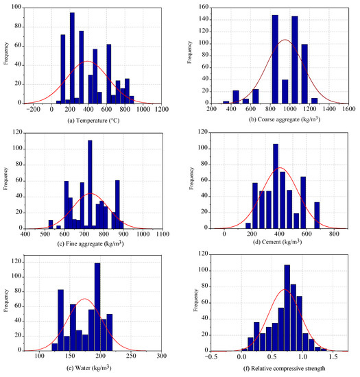 It should be noted that the variation in the heating rate in the collected experimental records was between 0.77 °C/min and 25 °C/min. The heating rate affects the spalling behaviour of concrete, and a fast heating rate increases the temperature differences between the surface and inner parts of concrete resulting in elevated tensile stresses [48]. In addition, the heating rate could not influence the residual compressive strength [49]. The database in this study contains only the specimens that did not spall during or after a high-temperature exposure. In addition, many experimental studies did not accurately report the heating rates. Therefore, in this study, the heating rate was not included in the input parameters of the ANN. The statistical properties of collected data sets are represented in Table 1. The distribution of each quantitative input parameter in the data set is shown in Figure 3. In addition, the frequency of different SCMs (SF, FA, and GGBFS) and the various test methods for three types of aggregate, namely, siliceous, calcareous, and lightweight aggregate, are shown in Figure 4. Out of the total 500 data points, there were 306 data points for the residual test, 114 data points for the transient test, and 80 data points for the steady-state test method. The studies on lightweight aggregate are considerably limited compared to other types of aggregate, as seen in Figure 4, and for this reason, the effects of lightweight aggregate were only considered in Section 3.1, where the effects of test methods were evaluated using the ANN model.