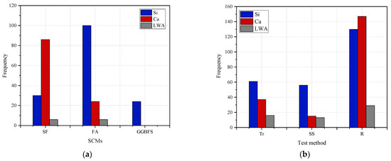 Distribution of (a) different types of SCMs (SF, FA, and GGBFS) and (b) test methods (Tr, SS, and R) in the database.