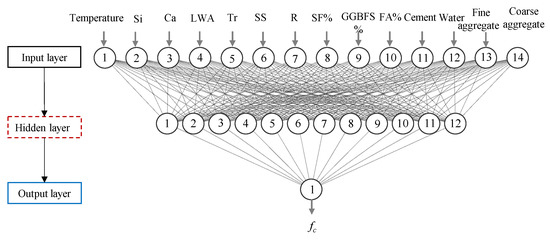 Several studies have used ML techniques to predict the compressive strength of different concrete types at room temperatures considering various influential parameters. Behnood et al. [21] proposed an ANN-based model to estimate the compressive strength of concrete containing SF at room temperature with acceptable error. It was found that when the percentage of silica fume to binder increased between 0 and 30%, the compressive strength of concrete with silica fume increased linearly. In addition, the maximum aggregate size significantly influences the compressive strength of SF concrete. In another study, Atici et al. [22] developed an ANN and multiple regression analysis (MRA) to estimate the compressive strength of concrete containing different amounts of fly ash and blast furnace slag at various 3, 7, 28, 90, and 180-day curing times. It was concluded that the nonlinear functional relationships in inverse problems, such as designing the concrete mix, could be calculated using the ANN model, which is impossible with classical regression methods. Chopra et al. [23] predicted the compressive strength of concrete with and without fly ash at different curing ages using two computing techniques, genetic programming (GP) and ANN models. It was found that the ANN model using the Levenberg–Marquardt (LM) algorithms for training the network is the most reliable prediction tool for this purpose compared to the GP model. Boğa et al. [24] used an ANN model to predict the mechanical properties and durability properties of concrete that contained ground-granulated blast furnace slag (GGBFS) and calcium nitrite-based corrosion inhibitor (CNI).