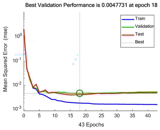 where and demonstrate the average values of the target and predicted outputs; and are the target and predicted values of the network, respectively. The values obtained for MSE, RMSE, and R are listed in Table 2. Moreover, in order to assess the performance of data, plots of the mean square error versus epoch (number of iterations) are used for training, validation, and testing [53]. Figure 6 shows the performance of the networks in predicting the compressive strength established in the MATLAB program. The blue line represents the decreasing mean square error of the training data set. The green line shows the validation error, which monitors the overfitting of the network [54]. Overfitting occurs in the network when the validation-error data begins rising [55]. The red line indicates the error of the test data used to determine the generalization capability of the model. The best performance is achieved at the lowest validation error when there is no further increase in MSE error [53,54,55]. The best validation of the performance of the proposed compressive strength ANN model was obtained at epoch 18, with a mean square error (MSE) of 0.00477, as shown in Figure 6.