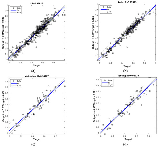 The regression plots of the proposed ANN model for (a) all data, (b) training, (c) validation, and (d) testing.