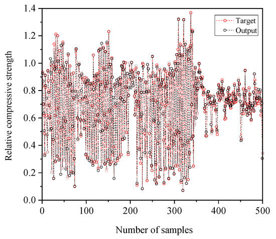 The coefficient of correlation (R), indicating the correlation between the target and predicted (output) values for train, validation, and testing, and all data points, is shown in Figure 7a–d. It can be seen that the coefficient of correlation for all data points was 0.966 for the developed ANN model. The optimal value for R is one, and the optimal value for MSE and RMSE is zero [56]. Thus, the obtained values-of-error metrics indicate the satisfactory performance of the proposed network with a large number of input variables. The comparison of prediction results of the ANN model and the experimental data points of the relative compressive strength of concrete is illustrated in Figure 8. It can be seen that the ANN model predicts the experimental results with acceptable accuracy.