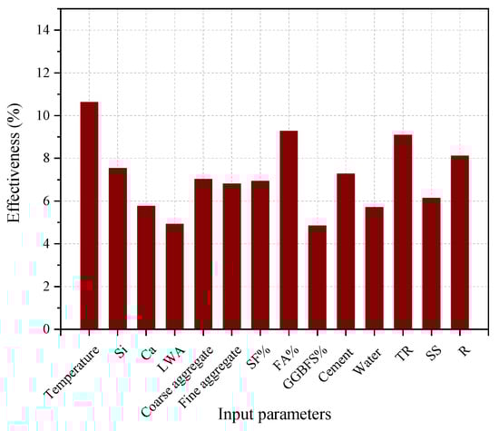 The sensitivity analysis is used to determine how input variables contribute to the output of a network. In this way, the user can reduce the size of the network by eliminating insignificant input parameters [57]. This technique identifies the most important input parameters considered by the network. The results of the sensitivity analysis in this study are shown in Figure 9. It revealed that the temperature level is the most important parameter in the results of the developed ANN-based models compared to other input variables.