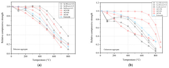 The available research works are limited to high-strength concrete containing SF at 0–10% cement-replacement ratios. Accordingly, this study examines incorporating SF at replacement levels of 0%, 5%, and 10 % on the compressive strength of concrete with a water-to-binder ratio of 0.3. The prediction of the network for siliceous concrete compared to calcareous concrete exposed to high temperatures up to 800 °C is depicted in Figure 13. It can be seen that the concrete without SF shows slightly better performance than the SF concrete, particularly for 10% SF replacement for both Ca and Si aggregate concrete. Concrete containing SF exhibits a denser interfacial transition zone (ITZ) between cement paste and aggregates due to the filler effect of ultrafine particles and the pozzolanic activity of SF compared to ordinary Portland cement (OPC) concrete. Therefore, higher stress levels are produced in the ITZ because of the expansion of aggregate and contraction of paste with SF than that of the OPC concrete exposed to high temperatures. This causes more reduction in the relative compressive strength of SF concrete [6,64].