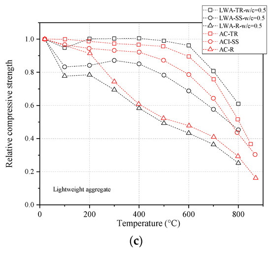 Around 100–300 °C, the compressive strength of various mixtures slightly increases or remains unchanged. This may be attributed to the possibility of steam curing resulting in additional hydration of unhydrated cement particles at temperatures 100–300 °C [43,83]. Additional hydration can be revealed by a decrease in phases (C3S + β-C2S) and an increase in the content of Ca(OH)2 [84]. Moreover, by comparing the results, it can be concluded that the temperature in which the maximum compressive strength occurs is almost the same for each SCM, and it is independent of aggregate type. This may be due to the dehydration of C-S-H, ettringite, and calcium aluminate hydrates which mainly depends on the ratio of CaO/SiO2 of the binder [85,86,87].