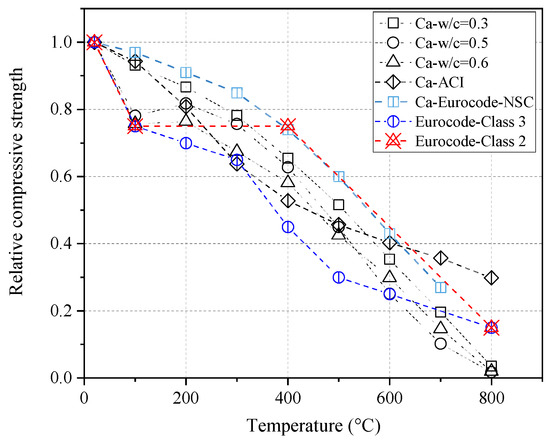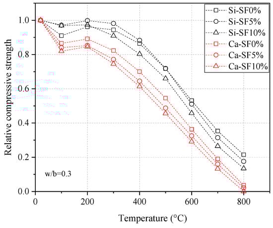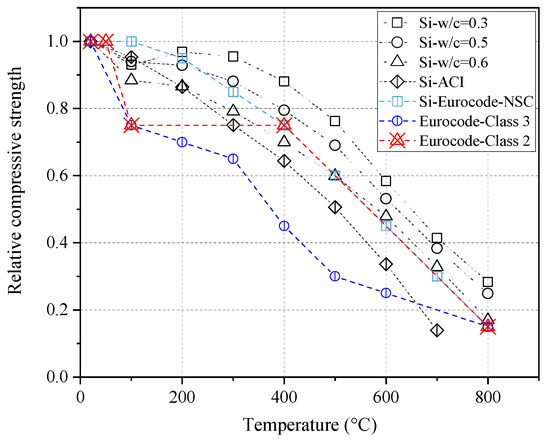 In order to analyze the effect of the replacement of cement with different SCMs, the relative compressive strength of concrete containing different contents of silica fume (0%, 5%, and 10%), fly ash (0%, 20%, 30%, and 40%), and ground-granulated blast furnace slag (0%, 30%, and 40%) at high temperatures up to 800 °C was investigated. The selected mix designs are represented in Table 5. It is worth noting that the provisions of both ACI 216.1 [62] and Eurocode [63] have not covered the effect of SCMs on the compressive strength of concrete at high temperatures.