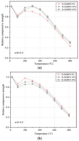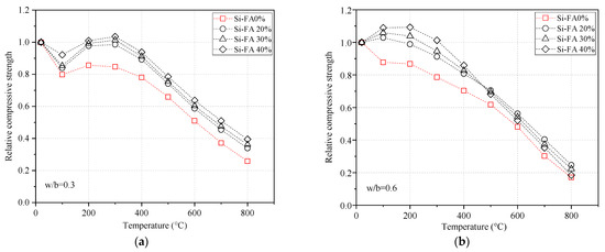 The influence of different contents of FA (0%, 20%, 30%, and 40%) on the compressive strength of siliceous aggregate concrete at w/b of 0.3 and 0.6 are plotted in Figure 14. The inclusion of FA increases the relative compressive strength of concrete compared to concrete without FA at all temperatures. However, the presence of FA in improving the relative compressive strength of siliceous concrete is notable up to 400 °C. Beyond this temperature, there is nearly no difference between 20%, 30%, and 40% FA concrete. The better performance of FA concrete is due to the pozzolanic reaction of FA particles and calcium hydroxide and the production of C–S–H gel which increases the strength of the concrete [46]. The addition of FA is slightly more effective in siliceous concrete with lower w/b.