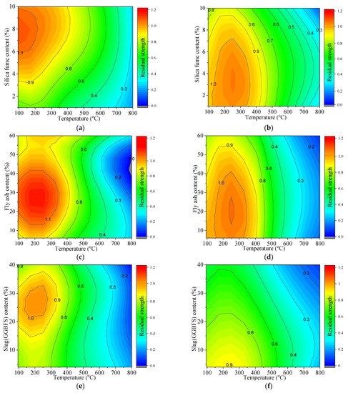 The influence of SCMs content in concrete with w/b of 0.6 on the residual compressive strength (a) Si-SF, (b) Ca-SF, (c) Si-FA, (d) Ca-FA, (e) Si-GGBFS, and (f) Ca-GGBFS.