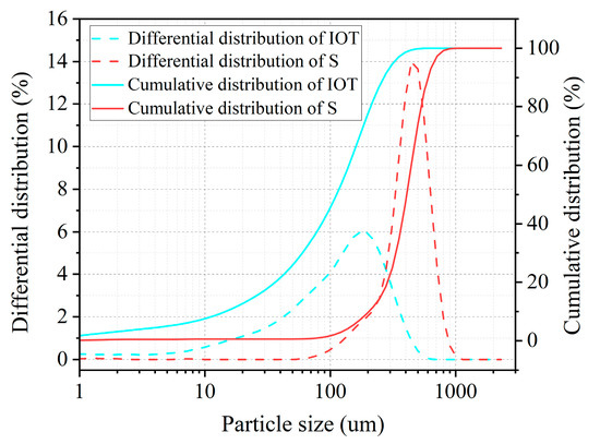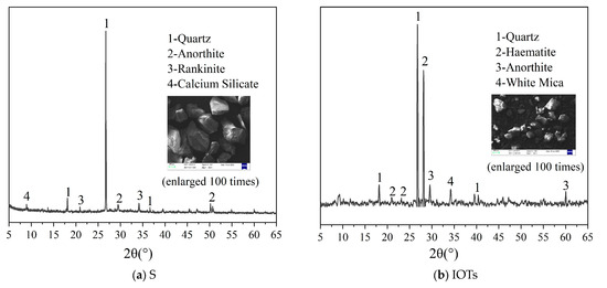 The fine aggregate used in this study comprised S and IOTs obtained from the Yaogou tailings pond in Shaanxi Province, and the main physical characteristics of S and IOTs are listed in Table 2. Meanwhile, the XRD and SEM techniques were employed to determine the main components and micro-morphology of S and IOTs, as shown in Figure 1. Figure 2 presents the particle size distribution curves of S and IOTs.