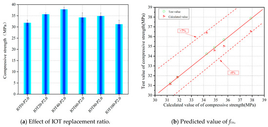 The relationship between the IOT replacement ratio and the fcu obtained is shown in Equation (1). Figure 3 shows the comparison between the experimental values and the predicted values calculated by Equation (1). It can be seen that the error range is −4–7%, which is relatively small.