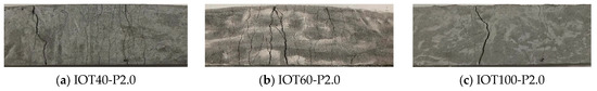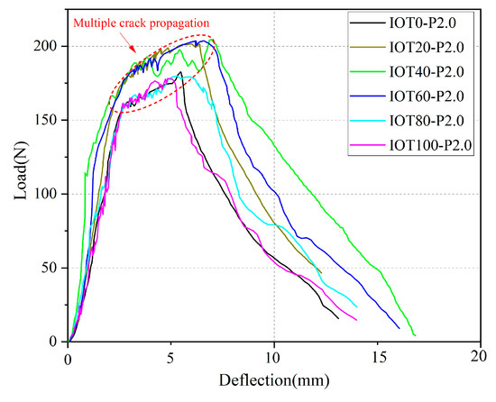 The load–deflection curves under the four-point flexural test of the IOT-ECCs are shown in Figure 6. Each load–deflection curve shows obvious deflection hardening. When the IOT replacement ratio is up to 80%, the load–deflection curve is full and the deflection-hardening part is obvious, especially for IOT40-P2.0. As shown in Figure 7, the specimens of IOT40-P2.0 and IOT60-P2.0 are broken by multiple cracks, while the number of cracks in IOT100-P2.0 is less.