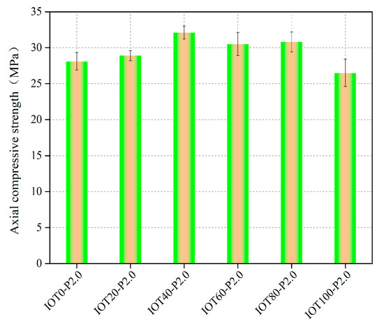 The fcu of IOT-ECCs was tested after 28 d, as shown in Figure 4. It can be seen from Figure 4a that the fcu of the IOT-ECCs increases first and then decreases as the IOT replacement ratio increases. Upon reaching 80% of the IOT replacement ratio, the IOTs have a positive effect on the fcu of the IOT-ECCs, especially 40%. For example, the fcu of IOT20-P2.0, IOT40-P2.0, IOT60-P2.0, and IOT80-P2.0 are increased by 10.73%, 15.94%, 7%, and 8.7%, respectively, compared with IOT0-P2.0. Similar observations have been observed in previous studies [22]. However, under the 100% IOT replacement ratio, the fcu of IOT100-P2.0 is lower than that of IOT0-P2.0. Similarly, Zhang et al. [23] and Zhao et al. [5] reported that the fcu of ultra-high-performance concrete with a 100% IOT replacement ratio decreased by 9.5% and 14%. This is because internal pores could be filled and optimized by the fine IOT particles when incorporating up to 80% IOTs, increasing the bonding stress between the PF and the matrix [24], resulting in the spatial grid system formed by the randomly distributed fibers in the matrix being firm [25,26]. However, when incorporating a 100% IOT replacement ratio, the decrease in cement slurry per unit area is caused by the high specific surface area of the IOTs, which reduces the bonding strength. Another main reason for the decrease in fcu is due to the formation of hydration products around the un-hydrated cement, which hinders further hydration, resulting in increased porosity. This is also confirmed in Section 5 and Section 6.