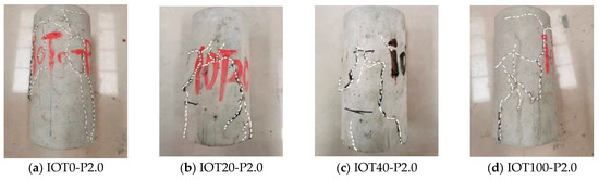 The fc is also a crucial parameter for evaluating the mechanical properties of IOT-ECCs in engineering design. Figure 8 illustrates in detail the effect of the IOT replacement ratio on the fc. Similarly, the fc of IOT40-P2.0 with a 40% IOT replacement ratio undergoes a marked increase, which increases by 12.5%. In contrast, the fc of IOT100-P2.0 shows a reduction of 5.7% when IOTs are completely replaced. Figure 9a–d show the failure phenomena. No spalling occurred in the samples as the IOT replacement ratio increased.