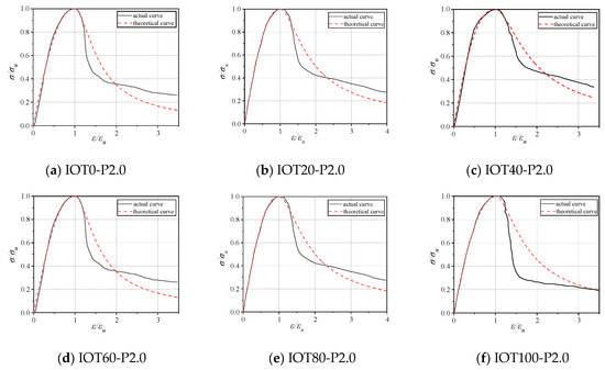 Nonlinear regression analysis was carried out on the dimensionless stress–strain curve using Equations (8) and (9), and the theoretical curve obtained is shown in Figure 10. Table 8 displays the values of parameters A and B, and the correlation coefficients (R2). It can be found that the theoretical curve obtained is in excellent agreement with the test curve.