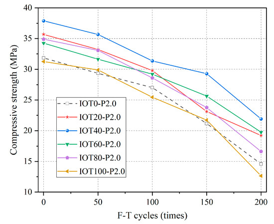 After 50, 100, 150, and 200 F-T cycles, the fcu of the IOT-ECCs under the sulfate F-T cycle is shown in Figure 11. The fcu of each species quickly decreases with the F-T cycle. For example, the fcu of IOT0-P2.0, IOT20-P2.0, IOT40-P2.0, IOT60-P2.0, IOT80-P2.0, and IOT100-P2.0 after 200 F-T cycles decreased by 54.19%, 46.13%, 42.17%, 42.33%, 52.4%, and 59.56%, respectively. The main cause of this is the gradual increase in internal deformation with the F-T cycle. Up to 80% IOTs can inhibit the decrease in fcu, especially 40%, which is significantly higher than that of IOT0-P2.0. However, a 100% IOT replacement ratio accelerates fcu reduction.