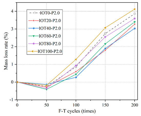 The mass losses of the IOT-ECCs after 50, 100, 150, and 200 F-T cycles are presented in Figure 12. The mass loss of each specimen first increases and then quickly decreases with the F-T cycle. This is because, initially, SO42− diffuses by the pores into the specimens, which is consumed by Ca(OH)2, forming CaSO4·2H2O and 3CaO·Al2O3·CaSO4·31H2O, increasing specimen mass, as demonstrated in Equations (10) and (11). As corrosion progresses, an increasing amount of corrosion products (gypsum and ettringite) accumulate, exerting expansion forces on the inner walls of the pores. The pores undergo rapid expansion due to the combined effect of expansion force and F-T force, resulting in the formation of interconnected micro-cracks that hasten the deterioration of the matrix. After 200 F-T cycles, the mass losses of the IOT-ECCs with 20%, 40% 60%, and 80% IOTs are less than that of the IOT0-P2.0. Unfortunately, the mass loss of the IOT-ECC with 100% increased by 6.3% more than that of the IOT0-P2.0.