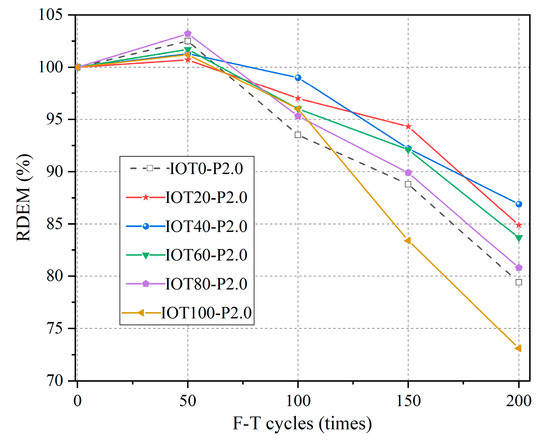 The RDEM is another crucial indicator for assessing the durability of IOT-ECCs. The RDEM of the IOT-ECCs after 50, 100, 150, and 200 F-T cycles are shown in Figure 13. The RDEM trend follows a similar pattern to the mass loss. The RDEM of the IOT-ECCs increases as a result of effective pore filling by gypsum and ettringite under fewer than 50 F-T cycles. However, the RDEM of each specimen decreases rapidly after 100–200 F-T cycles, especially for IOT100-P2.0. This is mainly because the change in the RDEM is closely linked to the internal pores. The increase in F-T cycles leads to the formation of numerous micro-cracks, which accelerate deterioration and decrease the RDEM. The RDEM of the IOT-ECC with 100% IOTs decreased by 8% more than that of the IOT0-P2.0 after 200 F-T cycles. In contrast, the RDEM of the remaining specimens, including IOT-ECCs with 20%, 40%, 60%, and 80% IOTs, are higher than that of the IOT0-P2.0.