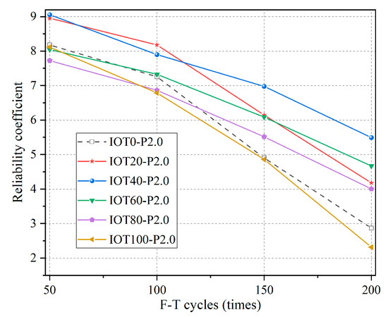 The calculation results of the F-T damage reliability analysis model are shown in Figure 14. The β(n) decreases as the number of F-T cycles increases. The β(n) of IOT0-P2.0, IOT20-P2.0, IOT40-P 2.0, and IOT60-P2.0 remain at a high level after 200 F-T cycles, especially IOT40-P2.0. The β(n) of IOT100-P2.0 is lower than that of IOT0-P2.0. The β(n) of the IOT-ECCs from highest to lowest is IOT40-P2.0 > IOT60-P2.0 > IOT20-P2.0 > IOT80-P2.0 > IOT100-P2.0, which is consistent with the test results. This indicates that the reliability model can better reflect the F-T damage to the IOT-ECCs.