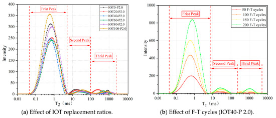 Figure 15 shows the T2 spectrum curves of the IOT-ECCs. Three signal peaks including a main signal peak and two secondary signal peaks are observed in each T2 spectrum curve, and the primary signal peak has a significantly higher signal intensity than the secondary signal peaks, as shown in Figure 15a,b. This suggests that the specimen contains a greater number of micro-pores, compared to medium and large pores, and the matrix mainly contains micro-pores [30,31]. The T2 spectral curve shows a rightward shift as an increase in both the IOT replacement ratio and F-T cycles, which indicates that the percentage of medium and large pores increases.