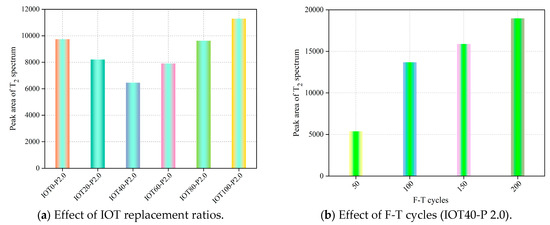 The area of each T2 spectrum curve’s three peaks is presented in Figure 16a,b. When replacing S with 20–80% IOTs, the peak areas are reduced by 15.78%, 33.75%, 18.8%, and 1.19%, respectively, indicating that incorporating IOTs can effectively reduce the internal pores, especially 40%, which is one of the reasons why IOT40-P2.0 has the highest strength compared to that of others. Under a 100% IOT replacement ratio, the internal porosity of IOT100-P2.0 is higher than that of IOT0-P2.0. Moreover, the peak areas increase gradually with the increase in the F-T cycle, especially more than 100 F-T cycles, which increased the peak areas significantly.