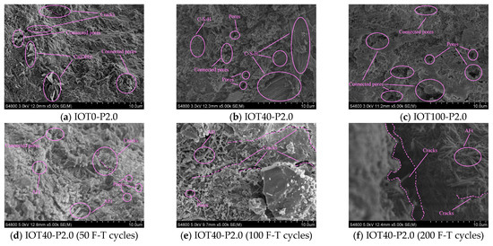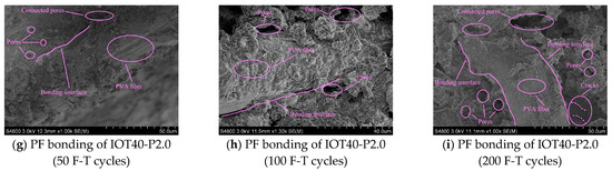 The micro-morphology of the IOT-ECCs is shown in Figure 17. As can be seen from Figure 17a–c, the IOT0-P2.0 matrix contains a small amount of Ca (OH)2, cracks, and connected pores. Under a 40% IOT replacement ratio, a significant reduction in the number of connected pores and micro-pores of the IOT40-P2.0 matrix is observed, while Ca (OH)2 is eliminated. In addition, many amorphous C-S-H gels are generated. However, the total number of connected pores and pores in the IOT100-P2.0 matrix has a noticeable increase when S is completely replaced by IOTs. Meanwhile, the density of the matrix is relatively poor compared with IOT40-P2.0 and IOT0-P2.0. Figure 17d–f show that within the pores and cracks of the IOT40-P2.0, corrosion products are formed, including rod-like gypsum and acicular ettringite after different F-T cycles. With the increase in F-T cycles, the dimensions of the pores and cracks are progressively expanding. Meanwhile, the abundance of acicular ettringite is observed near pores and cracks, especially at 200 F-T cycles. Figure 17g–i found that the PF and the matrix have good adhesion after 50 F-T cycles, and there are few pores at the bonding interface. However, after 100 F-T cycles, there are many pores at the bonding interface of the PF and the matrix. The bonding interface of the PF and the matrix significantly deteriorated after 200 F-T cycles.