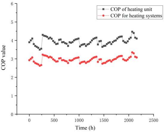 - During the test period, the average COP of the heat pump unit was 3.95 in winter and 4.45 in summer, and the average COP of the heat pump system was 2.96 in winter and 3.25 in summer, taking into account the power consumption of the wastewater pump, intermediary pump, and end circulation pump;
