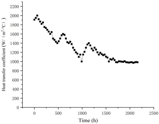 - Fouling has a huge impact on the heat transfer effect of the sewage heat exchanger. When the system initially operated, the heat exchanger was free of fouling generation, and the heat transfer coefficient of this sewage heat exchanger could reach the maximum value of 2003 W/(m2 °C). When the unit ran smoothly for a period of time, the thermal fouling resistance gradually increased, the heat transfer coefficient of the sewage heat exchanger gradually decreased, and its heat transfer coefficient finally stabilized at approx. 982 W/(m2·°C);