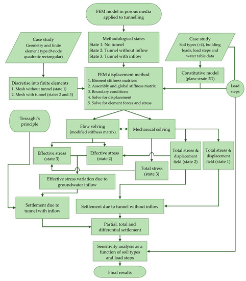The problem to solve was formulated by starting from the application of the FEM to a porous media [22,23,24,25,48]. It was intended to know the effect of Terzaghi’s principle when estimating the settlement of a building due to tunnelling in granular soils. The process followed requires the study phases of an elastic problem with modelling in porous media (Figure 1). The weak form of the FEM was used, adding Galerkin’s approximation [55]. Including the Terzaghi’s principle in the FEM requires to know the effective stress and its variation due to the groundwater inflow into a tunnel. The problem of flow was solved in three phases, each of them in steady flow conditions. It should be noted that quantifying the settlement’s generation time is not under the scope of this work. Nevertheless, in a porous media composed by the soils of the study case (see Section 2.4), settlement appeared over a short period [31,56].