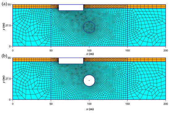 Illustration of the two-dimensional finite element mesh for the three methodological states. Cross-section of the macroscale domain (200 m-wide by 55 m-deep). (a) State 1: before the tunnelling, and (b) states 2 and 3: after the tunnelling.