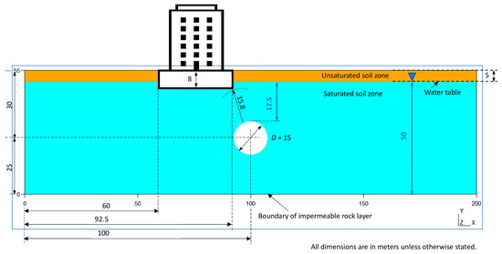 The study case refers to a prototypical situation that includes some flexibility and geological uncertainty. It is inspired by some types of soil, materials, and the rise of the water table (at certain times of the year) present in some reaches of the M-30 orbital motorway (Madrid). The assumed tunnel diameter of 15 m (Figure 4) corresponds to that of the tunnel boring machine Dulcinea, which was one of the largest in the world. It was used in tunnels of the above-mentioned M-30. The comparison of the results with models in oedometric conditions is not satisfactory because, among other considerations, they do not allow for evaluating the uplift of the tunnel. However, the ground’s subsidence has been monitored [60]. The diameter of 15 m chosen for the tunnel (Figure 4) is appropriate to evaluate Terzaghi’s principle with consideration of the effect on the differential settlement of buildings, both in the area influenced by the tunnel and on the contour of the tunnel itself.