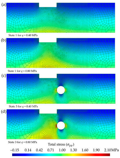 Cross-sectional distribution (domain of 200 m-wide by 55 m-deep) of the total stress (, in MPa). Comparison according to the combination of the methodological state and the load step (q, in MPa): (a) state 1 for q = 0.40 MPa, (b) state 1 for q = 0.80 MPa, (c) state 3 for q = 0.40 MPa, and (d) state 3 for q = 0.80 MPa.