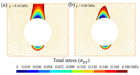 Total stress (, in MPa) distribution around the crown and invert of the tunnel cross-section. Illustration of decompression: (a) q = 0.10 MPa and (b) q = 0.80 MPa.