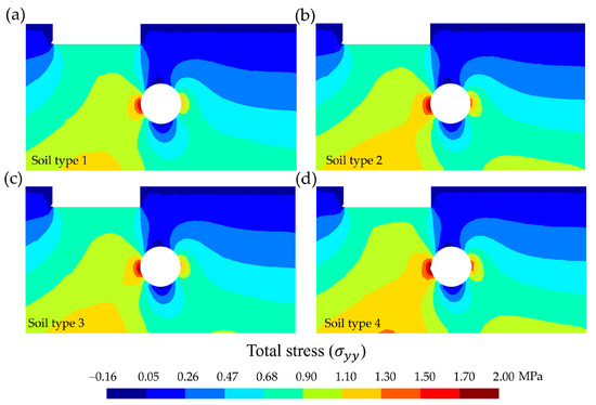 Cross-sectional distribution (selection of 100 m-wide by 55 m-deep) of the total stress (, in MPa). Comparison according to soil type for q = 0.80 MPa. (a) Soil 1: uniform sand, loose, (b) soil 2: uniform sand, dense, (c) soil 3: mixed-grained sand, loose, and (d) soil 4: mixed-grained sand, dense.