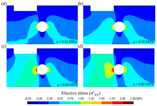 Cross-sectional distribution (selection of 100 m-wide by 55 m-deep) of the effective stress (, in MPa). Comparison according to load step (q, in MPa): (a) q = 0.10 MPa, (b) q = 0.30 MPa, (c) q = 0.60 MPa, and (d) q = 0.80 MPa.