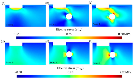 Cross-sectional distribution (selection of 100 m-wide by 55 m-deep) of the effective stress (MPa). Comparison according to state: (a) to state 1, (b) to state 2, (c) to state 3, (d) to state 1, (e) to state 2, and (f) to state 3.