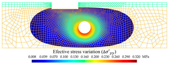 The tunnel construction generated a variation in the initial water level, and thus a water drawdown was induced by the tunnel excavation [42]. It follows that there will be a variation in the effective stress. This variation occurred in all four types of selected soils, depending on the load step, as illustrated for the case of soil type 4, selecting four load steps (0.10, 0.30, 0.60, 0.80 MPa) for the effective stress, (Figure 8).