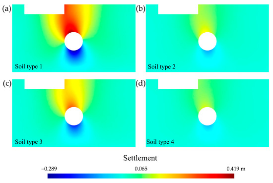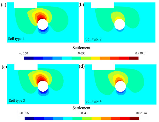 The displacement field generated by the tunnelling in non-oedometer conditions has possible displacement in both x and y directions. The greatest displacement occurred for soil type 1 due to its greater weakness in its mineral skeleton [56]. By operating with the displacement of states 1 and 2 (taking > 0 as the settlement directed towards the underlying rock layer and <0 as the settlement produced in the opposite direction), it was possible to obtain the vertical settlement due to the tunnelling without considering the groundwater inflow into the tunnel for the four soil types and the maximum load step q = 0.80 MPa (Figure 12). This settlement has complete freedom of sign, which allowed us to evaluate collapse due to decompression [72]. Tunnel uplift can be induced by a collapse of the tunnel invert due to decompression. This decompression, as seen in Section 3.2, is favoured by groundwater inflow into the tunnel. This type of collapse, the causes of which can be diverse and favour movement and even uplift in lined tunnels [73], has led some countries, such as Spain, to establish technical guidelines to avoid it [74].