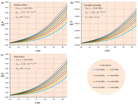 Settlement in the mat foundation (dy) versus horizontal distance (x) from the left end of the mat foundation. Comparison according to load step: (a) settlement without groundwater inflow, (b) settlement due to Terzaghi’s principle, and (c) settlement with groundwater inflow. The axis scales have been kept linear to facilitate the visualisation of nonlinearities.