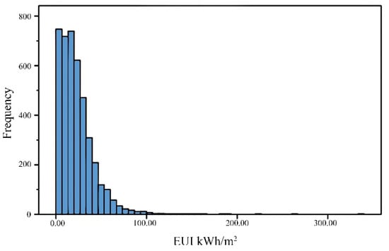 In addition, there were more detailed steps in processing electricity bills. Based on the survey results of the questionnaire, electricity consumption dominated over gas consumption for winter heating in residential buildings; therefore, the EUI of residential buildings is characterized by electricity consumption only. For the reliability of the energy data of the sample buildings, it is necessary to verify and process the collected energy data. During preliminary analysis, redundant data, zero energy consumption, and extremely low/high energy values were observed in the electricity bill data due to various objective influences such as changing the electricity meter, deviation in the data collection time, and occupancy rate. From the histogram of the EUI value distribution of each household (Figure 4), it shows that the EUI value distribution is skewed, resulting in energy analysis results based on the original data being underestimated. Therefore, the boxplot method was used to remove outliers [84]. As the logarithmic function is sensitive to changes in values between 0 and 1, the natural logarithm with e = 2.718282 can be used to transform the EUI values logarithmically and remove extremely small values. In contrast, the EUI values that have not been logarithmically transformed can remove extremely large outliers. Afterwards, the interpolation method replaced the outlier values with the median of the remaining household EUI values after removing the outliers for each building. The entire building was removed where the proportion of outlier households exceeded 50%. Then, the total energy consumption and under the assumption of a 100% occupancy rate for each building, were obtained. The calculation process is as follows: