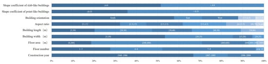 (1) Construction year (CY): For residential buildings in China, their construction methods, structural practices, thermal performance of materials, and other characteristics are constrained by the construction standards promulgated by relevant government departments. The standards have been revised and updated over time. For example, from 1986 to 1995, it was a trial period for China’s energy-saving design standards. In 1995, the “Energy conservation design standard for new heating residential buildings” JGJ26-1995 was officially released. In 2001, the national “Design standard for energy efficiency of residential buildings in hot summer and cold winter zone” JGJ134-2001 was issued. The relevant standards in Chongqing were promulgated in 2002. Thus, the CY is correlated with the building scale, form characteristics, and material thermal properties of the envelope. Moreover, the CY is easier to identify and collect than building materials; therefore, it was considered one of the research parameters.
