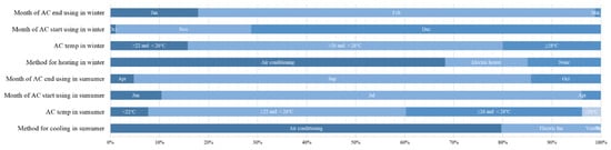 The collection of energy use behavior information in the study mainly included the methods used to improve heat comfort in summer and winter, types of equipment used, AC temperature setting, and operating time (Figure 6). The results showed that AC was the main cooling method in summer, accounting for 76%; the temperature setting was mostly between 22 °C (inclusive) and 26 °C, which was not energy-efficient, accounting for the largest proportion of 52%. The peak usage of AC in the summer was from July to September. AC was also mainly used for heating, accounting for 68% in winter. The temperature was mostly set between 26 °C (inclusive) and 28 °C, accounting for 64%. The AC usage in the winter was from December to February of the following year.