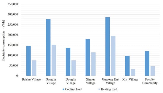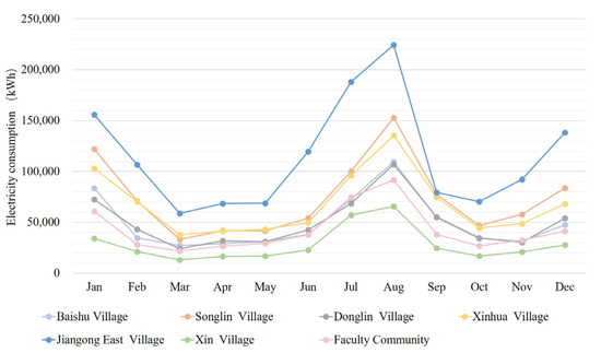The annual energy consumption of each residential district is shown in Figure 7. The distribution trends were similar, with the peak energy consumption in the summer occurring from July to September and the peak in the winter occurring from December to February of the following year. The energy consumption during the steady period from April to May could be considered the daily energy consumption of residents. Therefore, the energy for cooling and heating could be calculated by subtracting the energy during the steady period from the sum of energy consumption during the summer and winter. The calculation formulas are as follows: