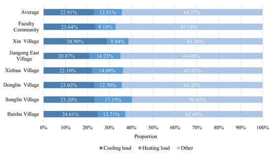The statistical results are shown in Figure 8, where the energy for cooling was much higher than that for heating. Based on the data from all households, the energy consumed for heating during the winter accounted for 55.91% of the energy consumed for cooling during the summer. As shown in Figure 9, the proportion of energy for cooling was 22.91% of the total annual consumption, while the proportion for heating was 12.81%, which accounted for 35.73% of the total annual energy consumption. The EUI for cooling was 5.21 kWh/m2, and for heating it was 2.91 kWh/m2.