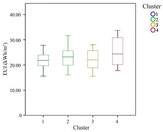 As shown in Figure 10, two vertical lines were drawn on the horizontal axis of the pedigree, and every intersection point of the vertical lines and the pedigree represents a type. When the sample buildings were divided into 3 or 4 types, the rescaled distances were relatively large, indicating that the grouping is relatively stable. The results were compared by setting 3 and 4 as the number of K values for K-means clustering. When divided into three types, the proportions of sample buildings in each cluster were 17.74%, 19.35%, and 62.90%, while the proportions were 20.97%, 54.84%, 15.32%, and 8.87% for four types, which led to a more uniform distribution. Meanwhile, the scatter plots in Figure 11 show that the classification criteria were more precise when divided into four types. Therefore, dividing the sample buildings into four types was chosen as the final result. At this point, box plots were used to analyze the of different residential building types (Figure 12), which showed significant differences in quartiles, medians, and overall data distribution of among the four types, indicating a reasonable classification [89]. Specifically, Type 1 had the characteristics of a FA less than 450 m2, facing eastward, and a lower overall EUI. Type 2 was characterized by a FA of less than 350 m2, mainly facing south. Type 3 was characterized by FA greater than 350 m2, facing southward. Type 4 was characterized by a FA of less than 350 m2, facing westward, and the highest overall EUI.