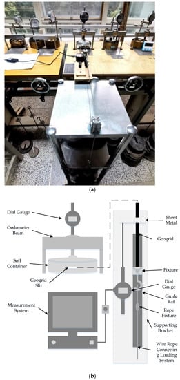 To reveal the interface creep behavior between compacted loess and geogrid, a stress-controlled pullout test device was needed. In our study, an oedometer was modified to achieve the above objectives. As shown in Figure 1, the modified pullout test device consisted of the following components: a normal pressure application system, a constant tensile load system, a measurement system, and a soil sample mold that is compatible with geogrid specimen. The normal pressure application system is provided by the original oedometer device. The constant tensile load system is realized through a pulley block and counterweights. The original consolidation container is modified to serve as a sample mold. The effective size of the mold is 7.98 cm in diameter and 2 cm in height, which is the most commonly used dimension for both consolidation tests and direct shear tests. A 1 cm long and 0.3 cm high narrow slit is cut in the middle of the height of the mold, so that the geogrid can stretch out from the mold through the slit and connect with the load system. Such dimension is big enough for the strip to pass through, and not too big to influence the stress state of the soil sample. The measurement system uses a dial indicator and a data collecting system to record the displacement of the pullout length of the geogrid. The data measurement system can automatically collect data at any time interval. In the initial stage of the test, the data are collected every 30 s, and gradually increased to 1–5 h according to the change rate of the deformation.